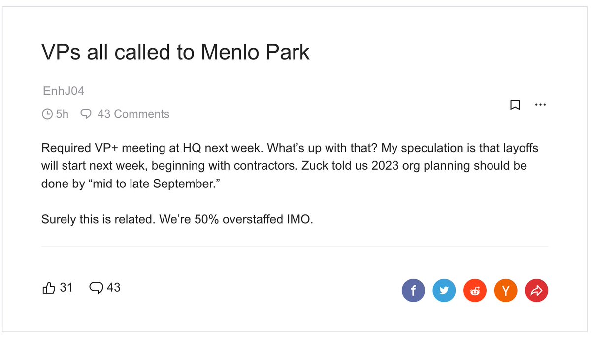 Zuck下周在Meta总部召集所有VP开会。有人预测是大裁员。