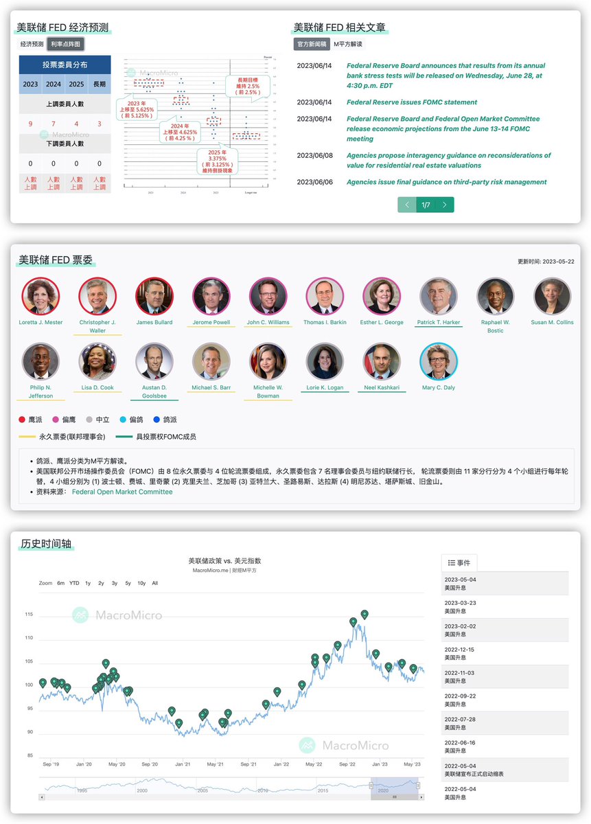 给对宏观经济感兴趣的朋友推荐一个网站“财经M平方”,全球宏观数据应有尽有,而且还都可视化了。附图仅是央行专区-美联储。美联储票委里还给你按偏鹰到偏鸽从左到右排序了。