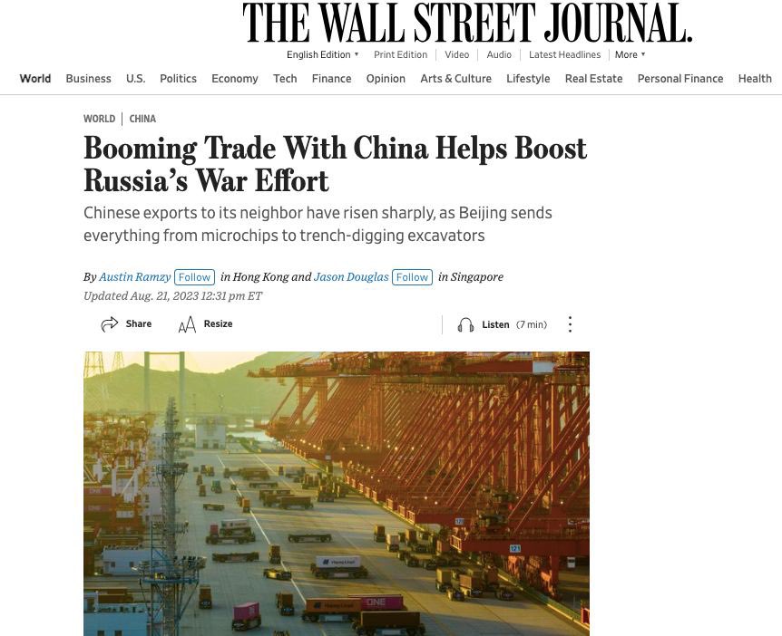 中國技術人員已經開始幫助俄羅斯人在被佔領土上修建防禦工事——《華爾街日報》 去年以來中國對俄羅斯出口大幅增長73%,中國與俄羅斯的貿易總額高達1340億美元,特別是俄軍在烏克蘭被佔領土上挖戰壕和修築工事用的挖掘機和其他設備, 中國公司向俄羅斯提供計算機芯片、噴氣式戰鬥機零部件以及導航和乾擾技術。
