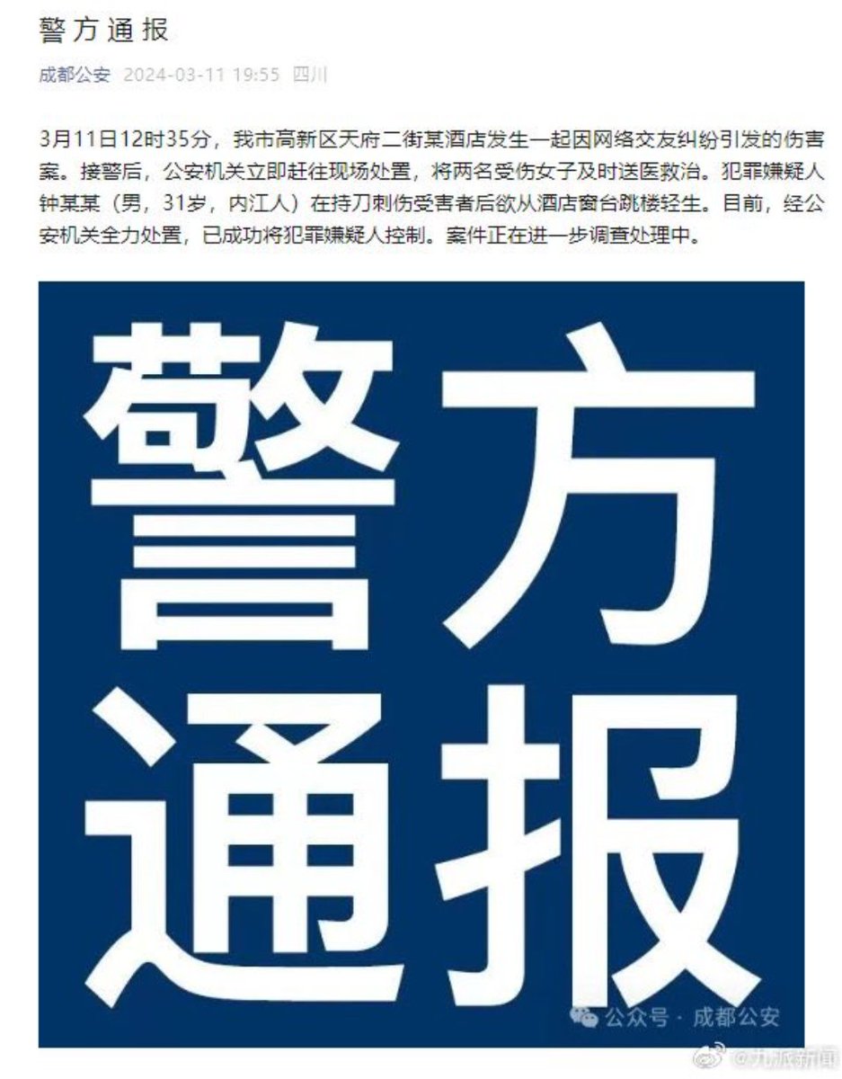 19点55分,成都公安发布警方通报称已经将犯罪嫌疑人控制。有两名女子受伤。