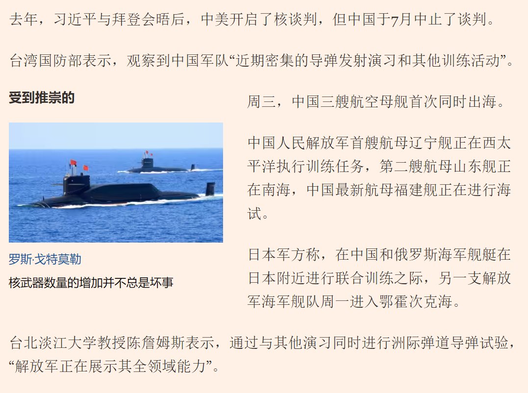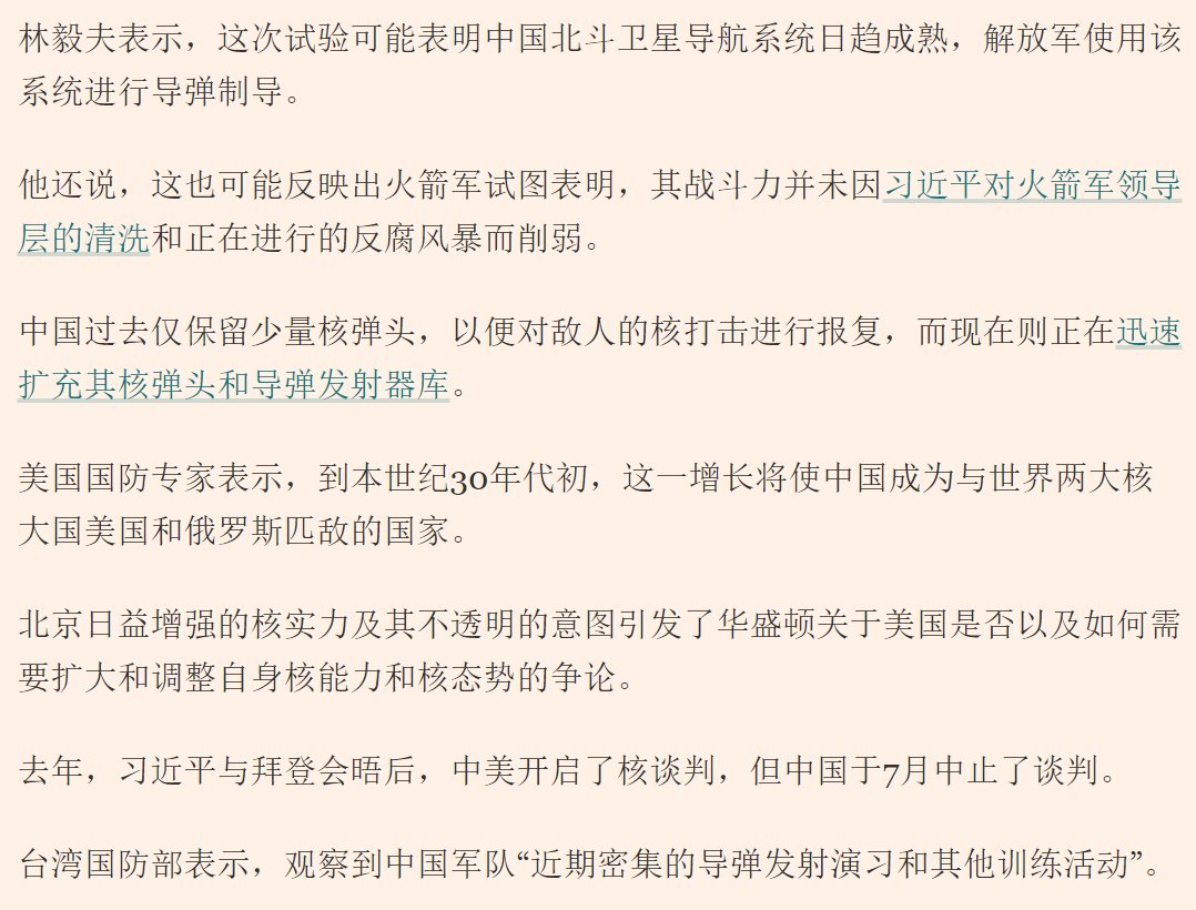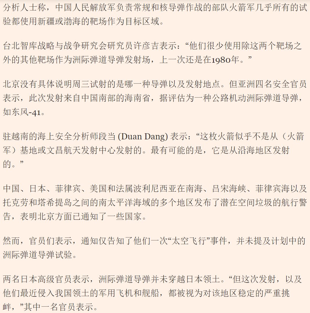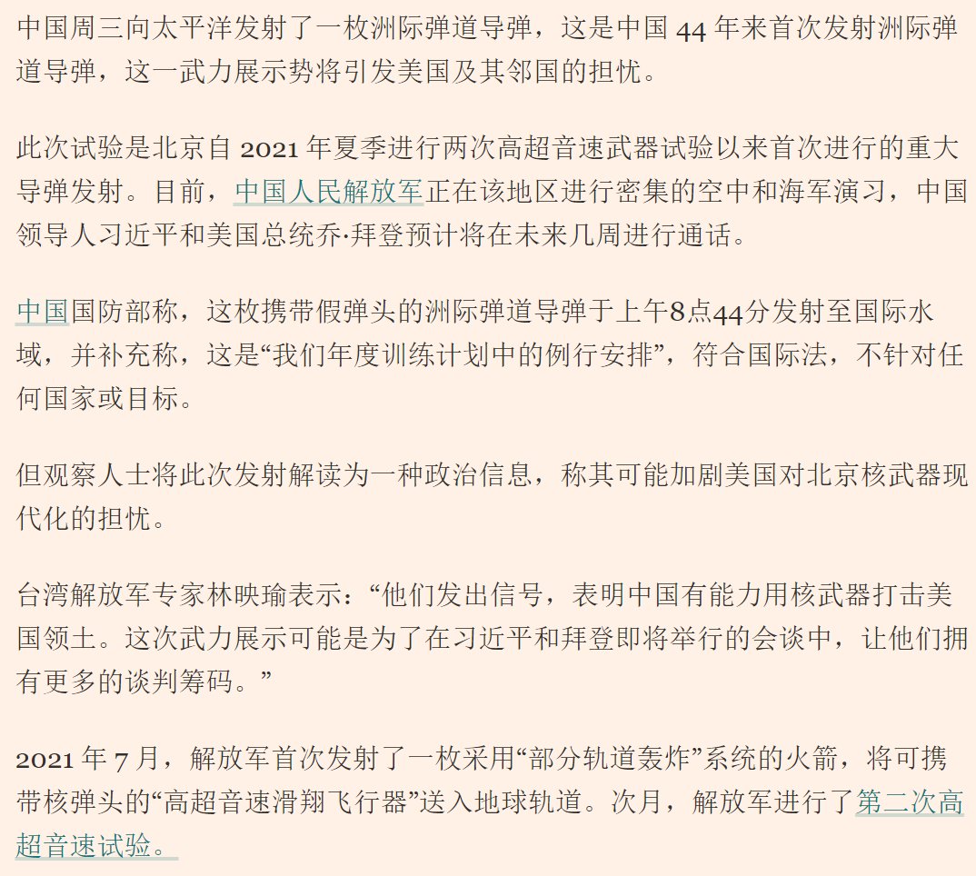 9月25日,中国向太平洋发射了一枚洲际弹道导弹,这是中国 44 年来首次发射洲际弹道导弹。此次试验是北京自 2021 年夏天进行两次高超音速武器试验以来首次进行的重大导弹发射。 中国国防部称,这枚携带假弹头的洲际弹道导弹于上午8点44分发射至国际水域,并补充称,这是“我们年度训练计划中的例行安排”,符合国际法,不针对任何国家或目标。