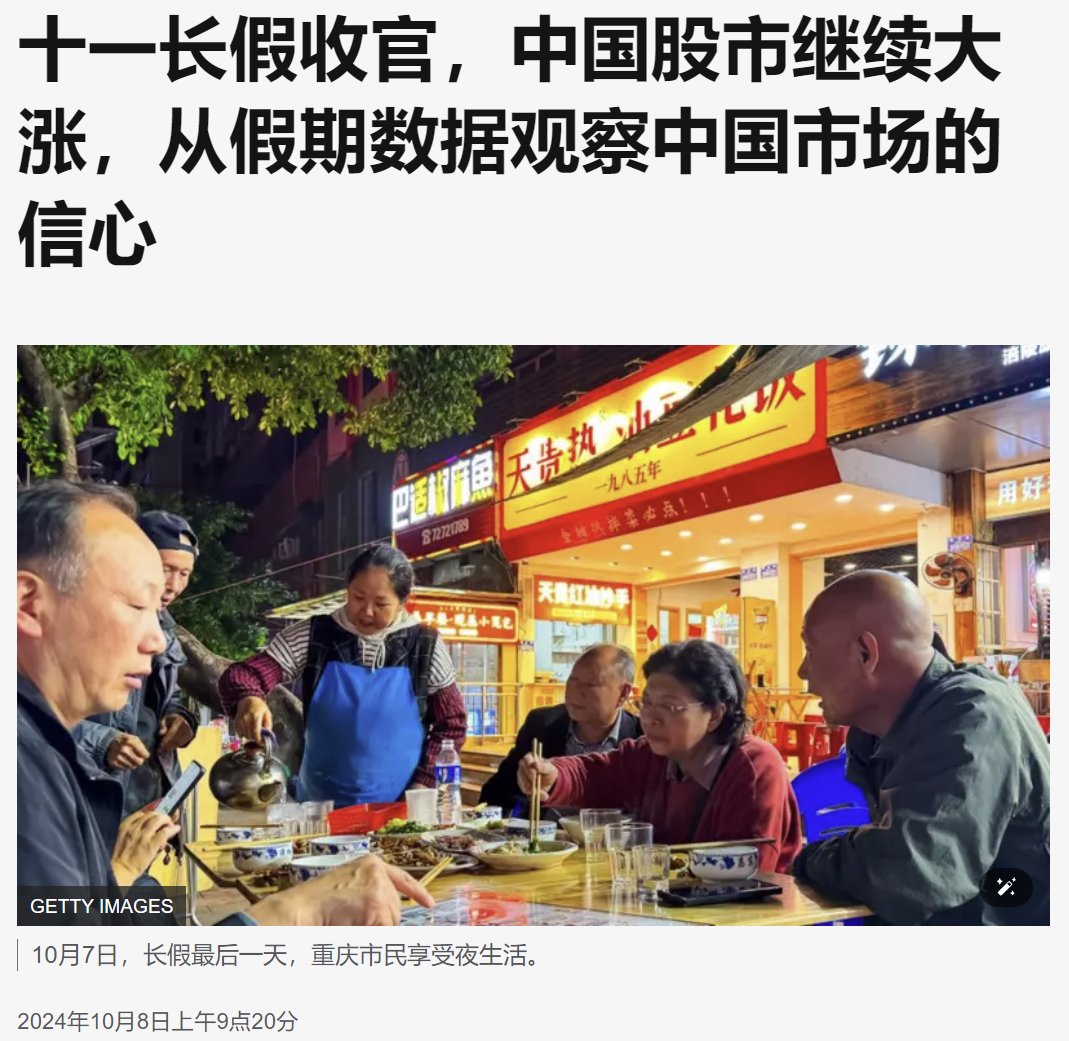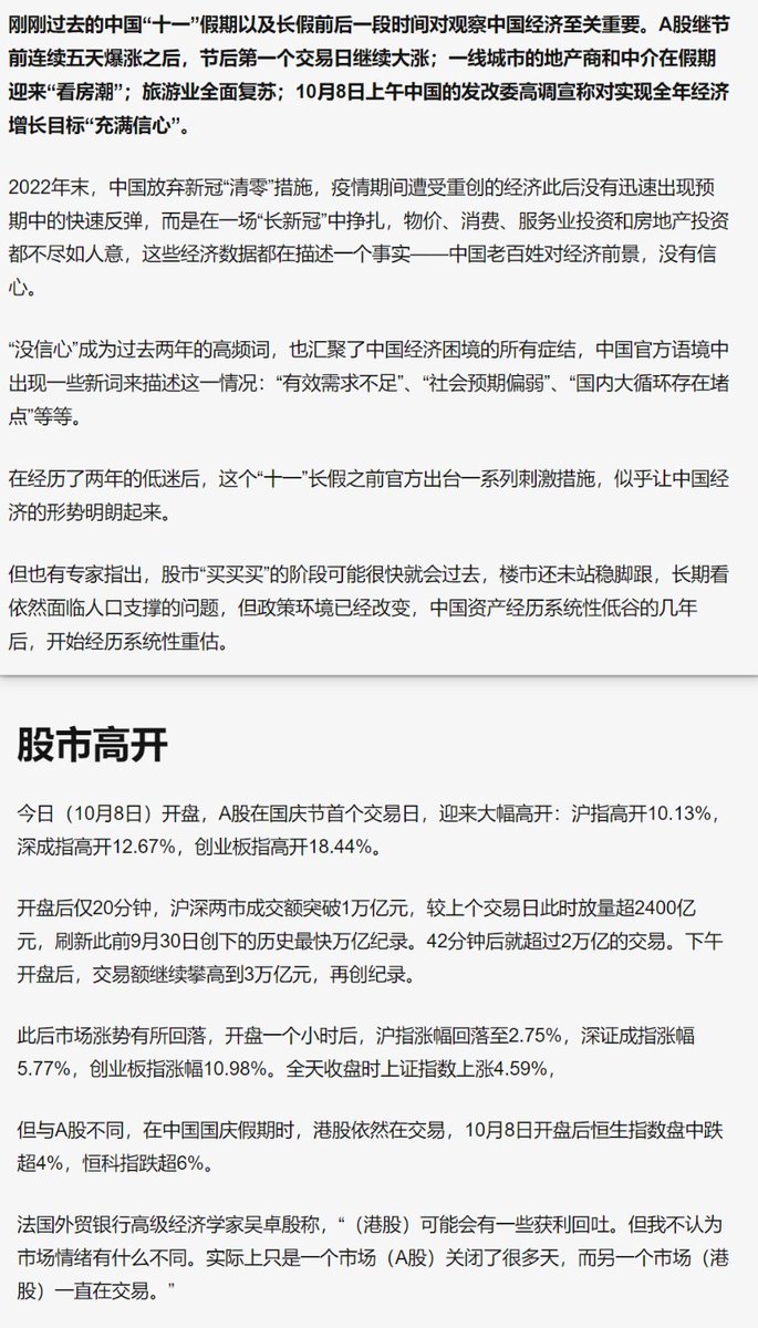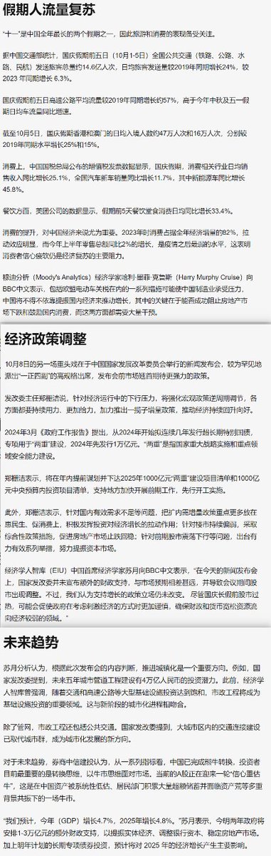 对这轮经济数据反弹的正面看法:10月8日,BBC发文,认为中国国庆前的经济刺激政策部分回应了市场的期待。假期旅游业复苏,楼市、消费数据的止跌回稳、以及股市的高开反映了人们的信心有所提振。高盛、花旗等投行也纷纷对在中国这一轮经济反弹中的投资给出了积极展望。
