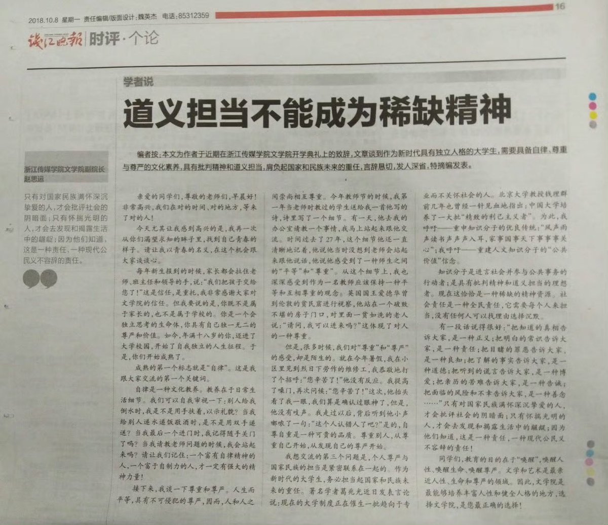 2018年9月30日浙江传媒学院副院长赵思运因在2018级新生开学典礼上作迎新致辞,后被校方给予严重党内警告处分。