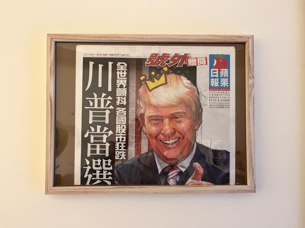 8年前,我剛踏進了媒體業,也剛進了大學。那時最令我震撼的,是這紙《蘋果日報》的號外,「#川普 當選,全世界顫抖,各國股市狂跌」。收集一些特殊事件以及不同國家的報紙,一直是我的興趣,或許我對於留存夕陽產業的一絲痕跡,有那種保存文化的自豪感。這幾年,這紙號外一直掛在我家牆上。8年後,我重返大學研讀碩士,《蘋果日報》早已不復存在,老闆黎智英在中共修訂「港版國安法」後入獄至今。而當年的標題,除了全世界依然顫抖外,股市卻出現截然不同的變化。