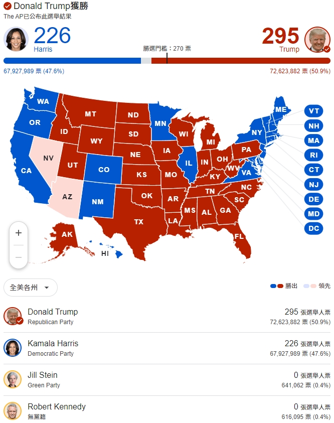 而最終的選舉結果,截稿前,內華達州與亞利桑那州尚未開票完成,但川普維持領先態勢。其餘的5個搖擺州,川普全面拿下。截稿前的數據如下: