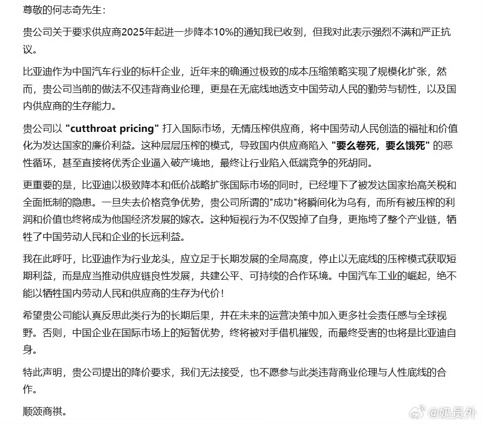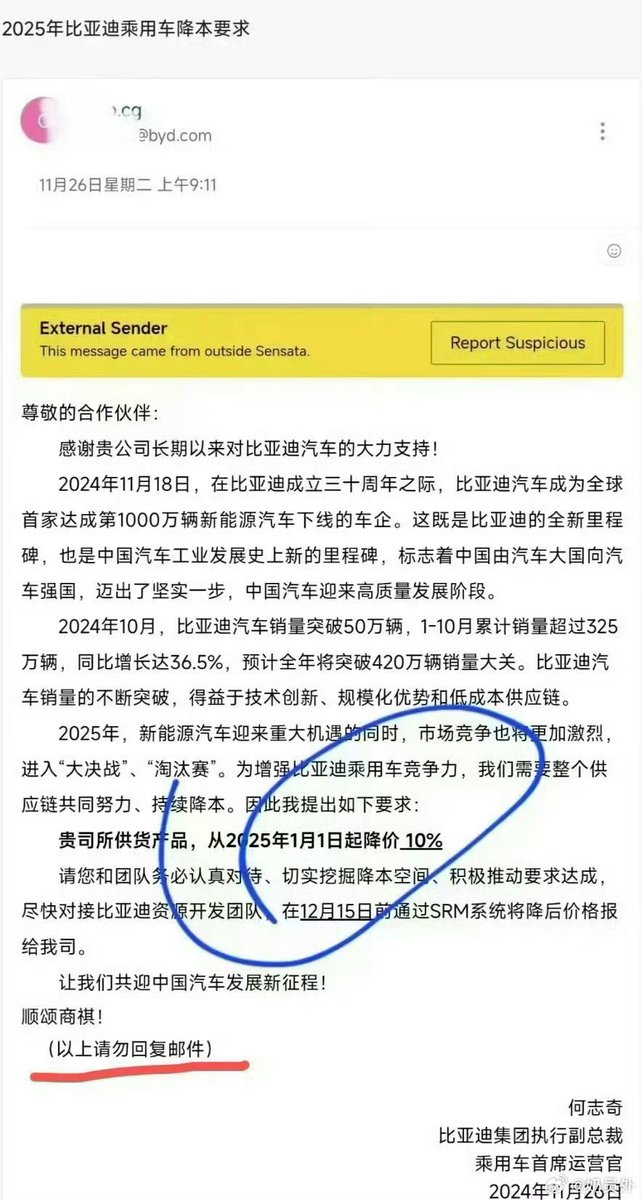 网传一封比亚迪发给供应商的邮件,称25年市场竞争将更加激烈,要求供应商降价10% 随后,有供应商回应,对此表示强烈不满和抗议,称比亚迪压榨供应商,将中国人民创造的价值化为发达国家的廉价利益,呼吁比亚迪停止靠压榨获取利益。