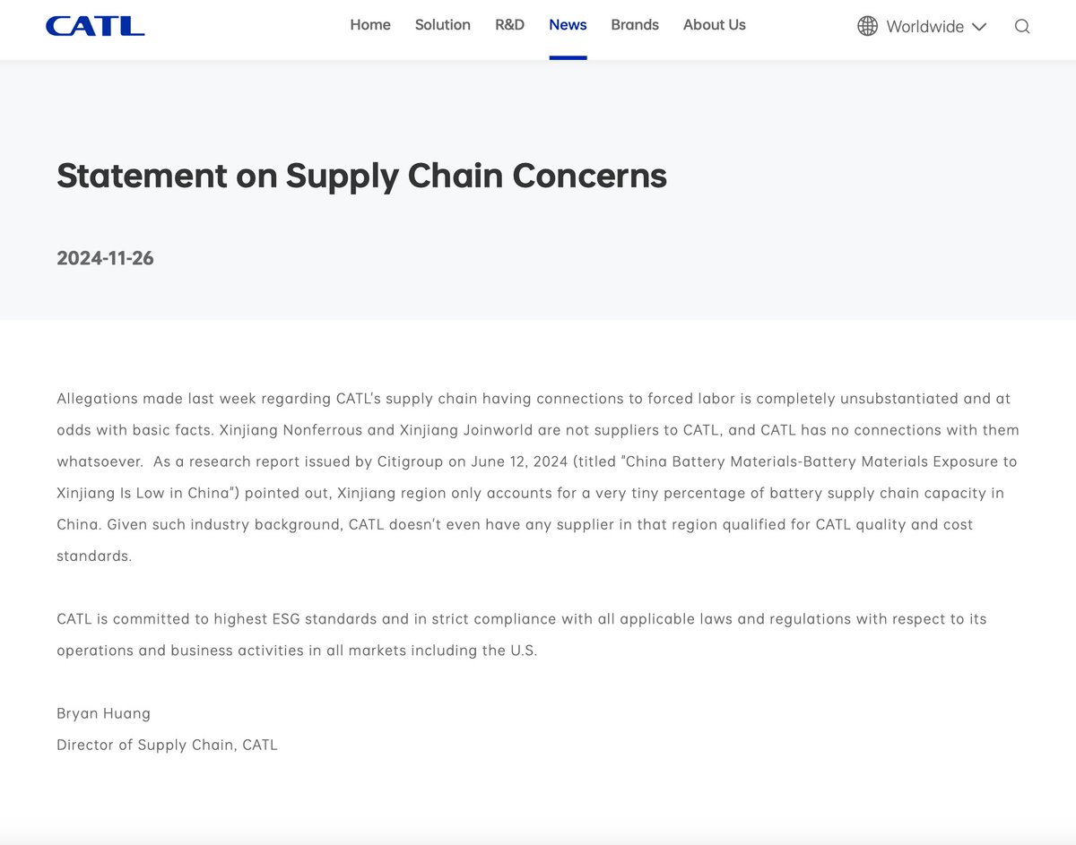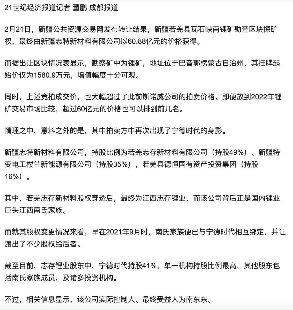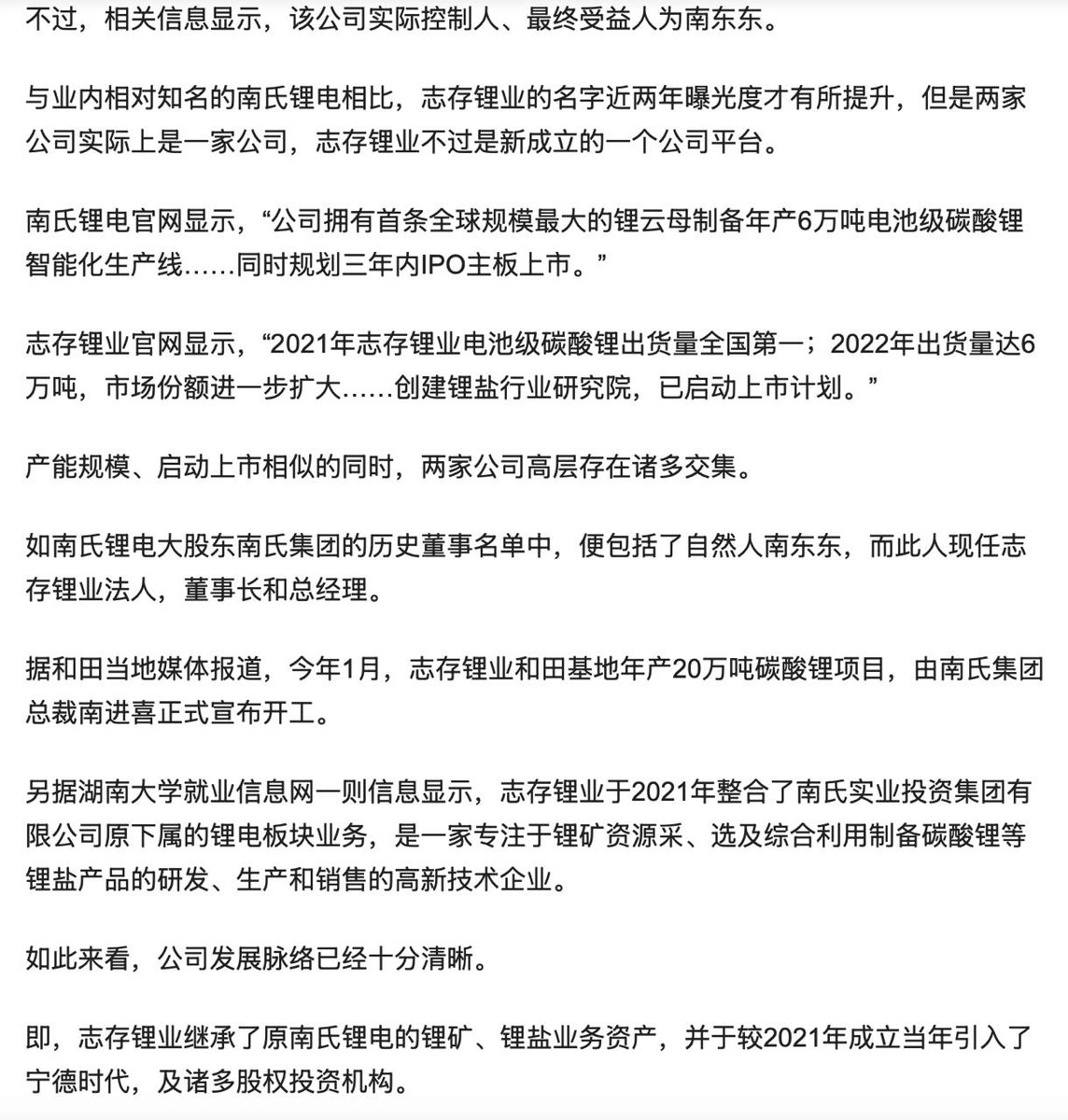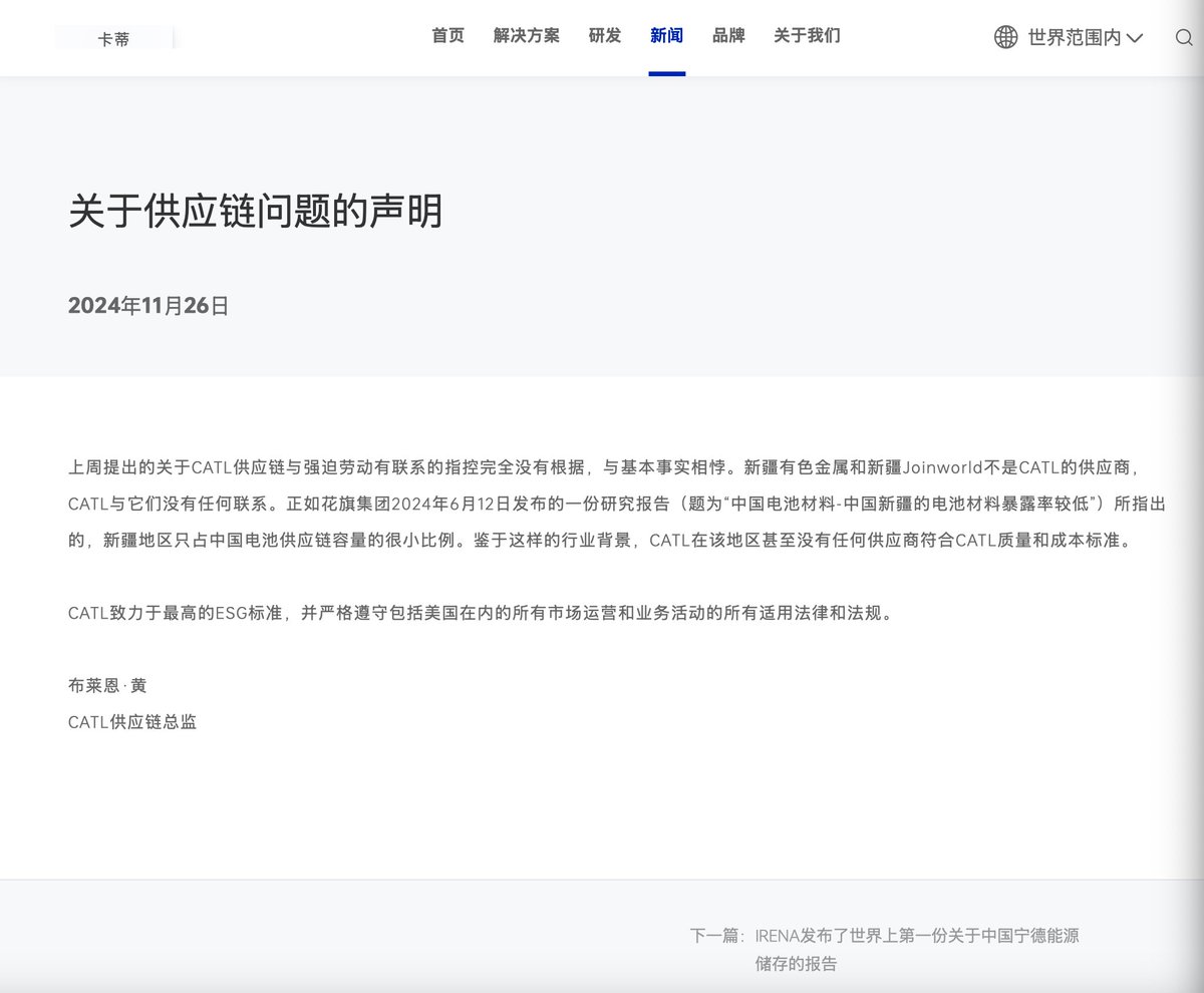宁德时代在英文官网发布声明称:不使用新疆制品在优衣库不使用新疆棉事件发酵后,有网友发现国内锂电池巨头宁德时代在其英文官网发布声明称,他们与新疆强迫劳动无关,其供应链中未使用任何新疆来源的供应商。但一篇报道显示,宁德时代实际持有新疆志特新材料股份。今年1月,该公司锂矿和田基地开工