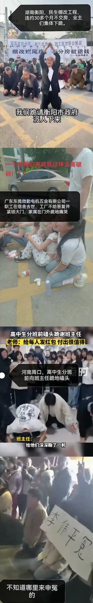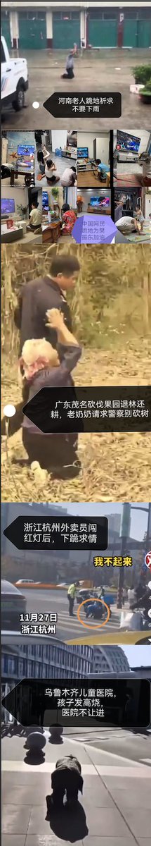 有网友恶意统计了近期国内发生的百姓下跪事件包含跪地讨薪,跪求实现案件的司法正义,医疗事故跪地维权,外卖员向交警跪求不处罚,烂尾房下跪求政府做主、跪地维权,为孩子能上某中学跪地,跪地为工作中去世亲属讨说法,高中分班磕头跪谢班主任,跪地伸冤,跪地为樊振东加油,老奶奶跪地求别砍果园