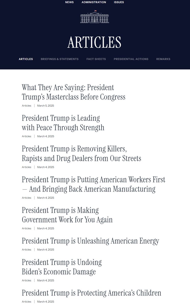 #观察 白宫网站日常的文风:《特朗普总统正在以实力引领和平》《特朗普总统和万斯副总统为美国人民挺身而出》《周一早上的胜利——“特朗普效应”》《特朗普总统将美国工人置于首位,并让美国制造业回归》《民主党人站在了美国人民的另一边》