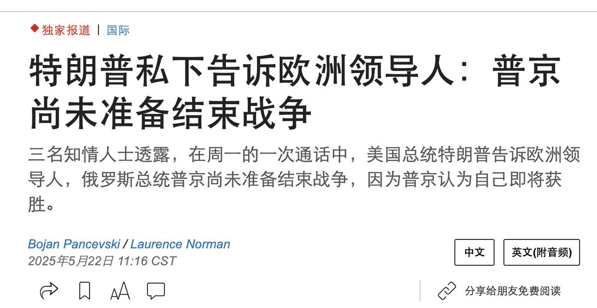 华尔街日报消息根据三位知情人士透露在周一的一次通话中,特朗普告诉欧洲领导人,普京并不准备结束战争,因为普京认为自己即将获胜。特朗普终于发现这一事实了吗?