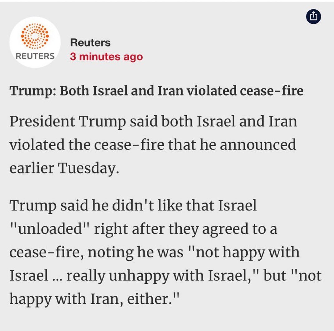 路透社报道,特朗普称,“他对以色列非常不满”。