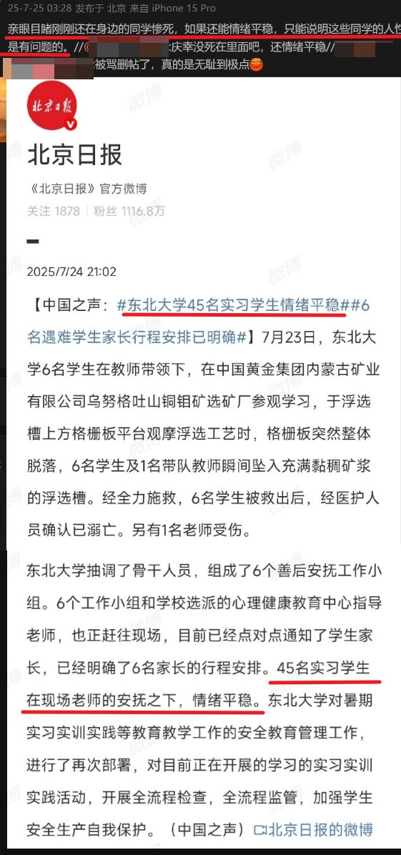 7月24日,北京日报报道称,在内蒙古矿业6名大学生遇难事故中,现场45名学生“情绪平稳”,被网友骂到删帖。