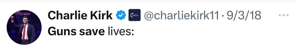 极右翼网红、阴谋论积极编造者Charlie Kirk被枪杀,生前一直鼓吹枪支拯救生命。也算求仁得仁了。按照他的逻辑,他不是去世,而是被拯救。愿它在地狱继续施展他的阴谋论才能、积极布道MAGA,迎接我大川总的到来。