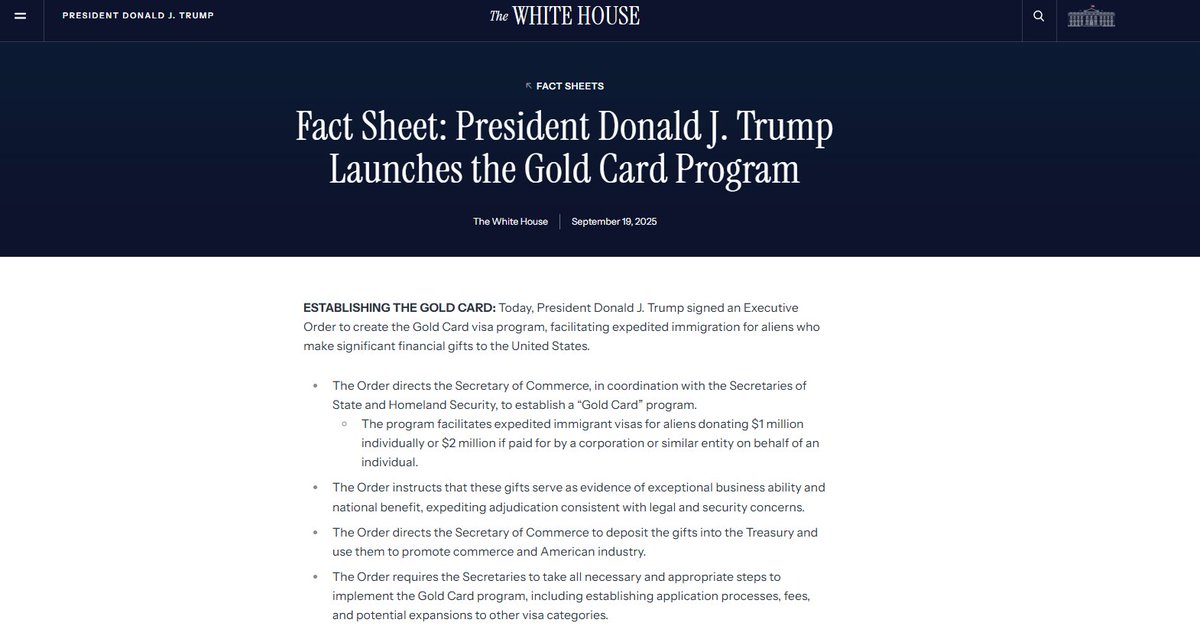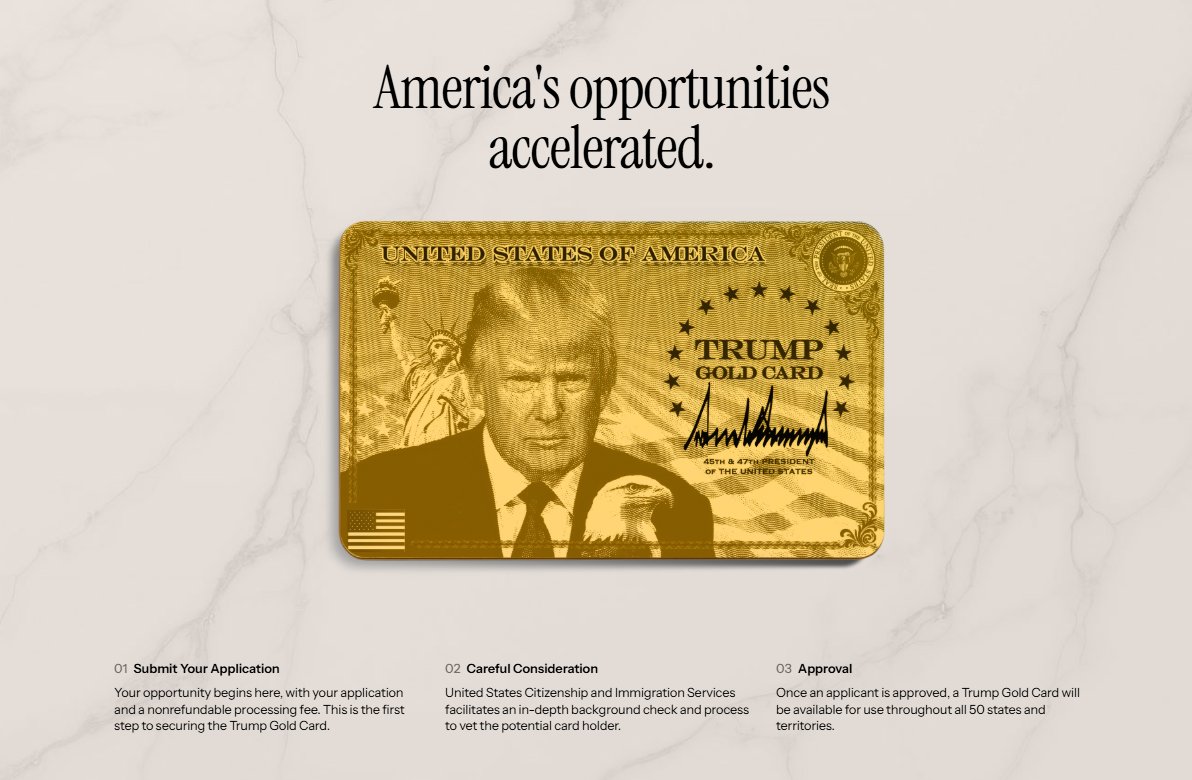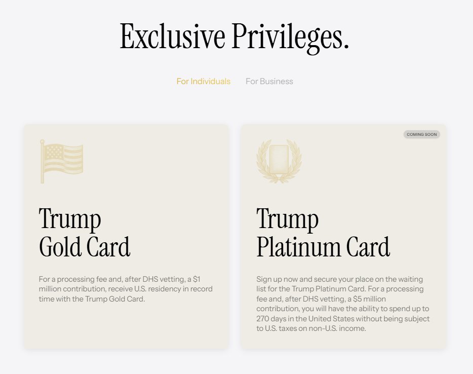 特朗普签署行政令,正式推出“特朗普金卡”签证计划,向全球富人出售美国居住权。个人申请“特朗普金卡”需支付100万美元,在经过国土安全部(DHS)审查后缴纳100万美元,即可以“创纪录的速度”获得美国居留权。更高级别的“白金卡”需支付500万美元,允许在美国停留长达270天,且无需为在美国以外地区获得的收入而纳税。企业也可为个人员工支付200万美元费用获得金卡,且企业可以借此为不限数量的员工获得美国居住权。特朗普要求企业需支付10万美元费用才能获得H-1B工作签证。
